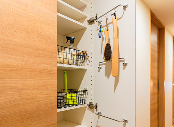 家族みんなが使いやすい玄関になるように収納を拡張しました。扉の内側に設置したバーに引っ掛けて収納ができたりと、ちょっとした工夫で出し入れがしやすくなっています。