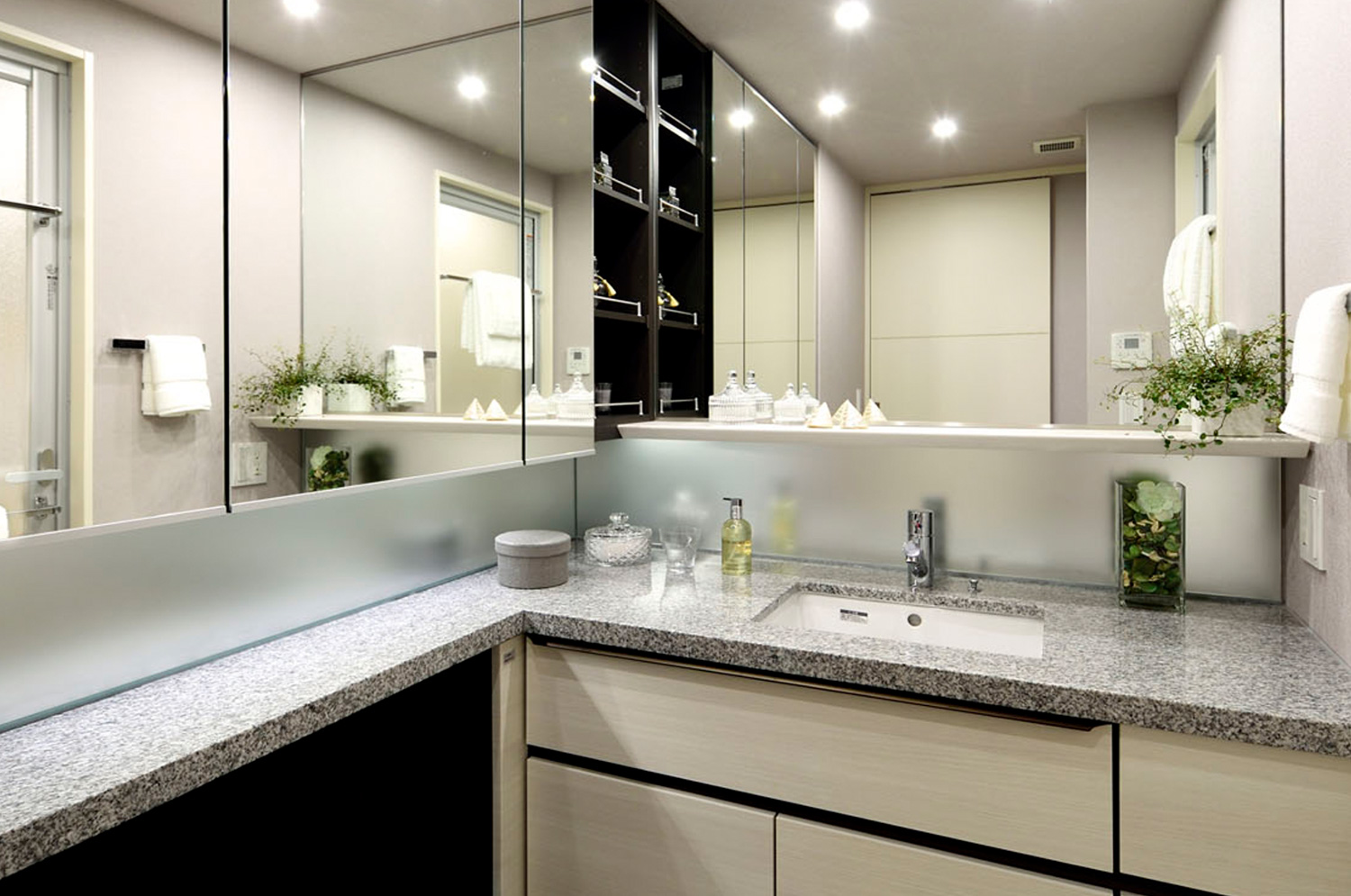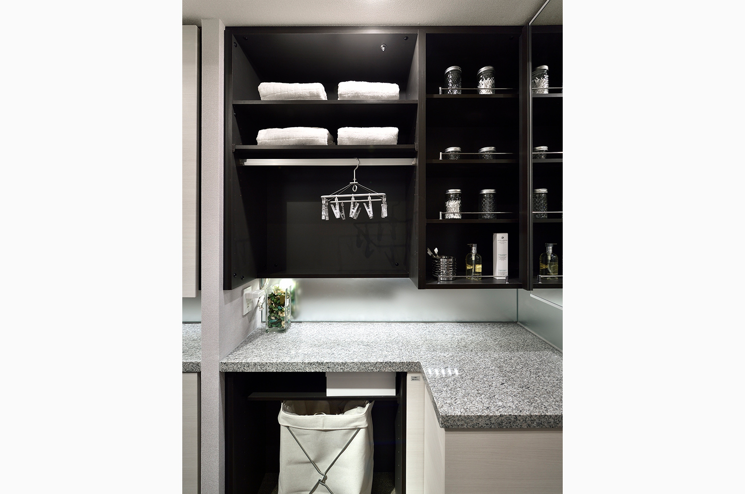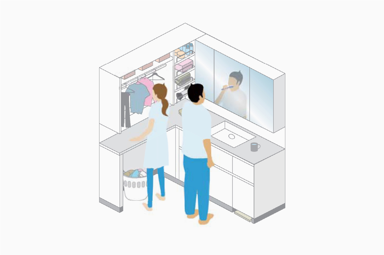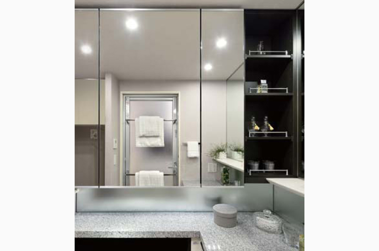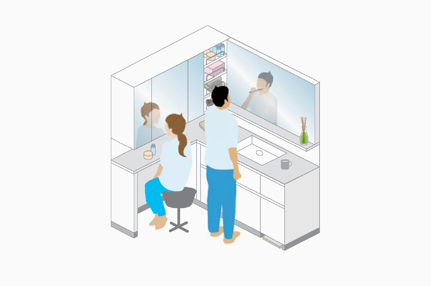 洗面台が使用中でも、もう1人が身支度可能な三面鏡つきのカウンタースペースを確保しました。また洗面台の鏡の前面には、ちょっとした小物が置ける棚をご用意。