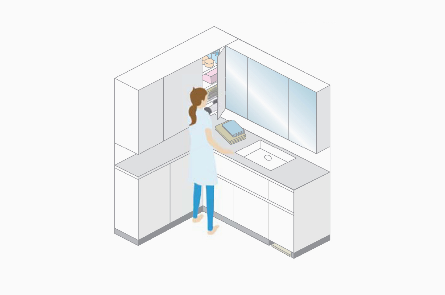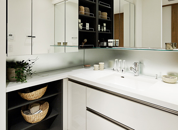 L型カウンターのリネン庫と収納の組み合わせで、3タイプから選べる洗面化粧台です。