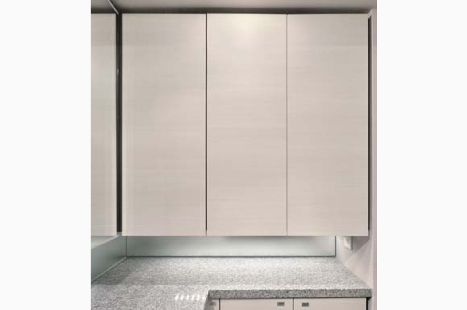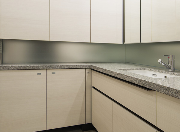 バスルームや水まわりで使うけれど見える場所には置きたくない…そんな日用品のストックなどを沢山しまえるように、大きな収納スペースをご用意しました。また、収納が扉付きで見た目にもスッキリ。